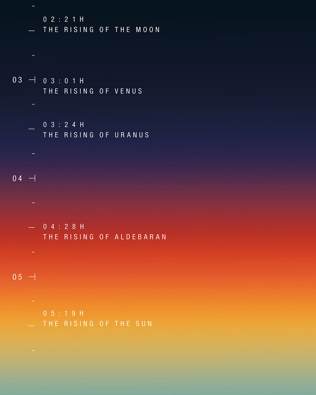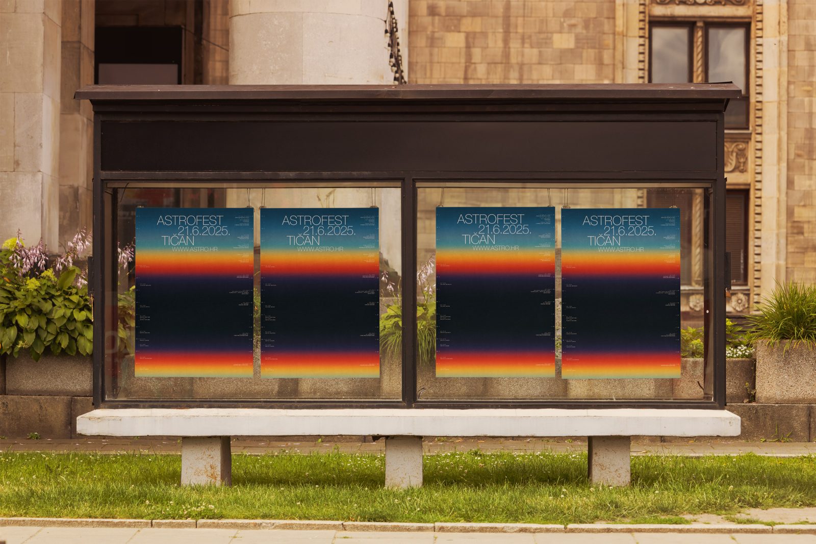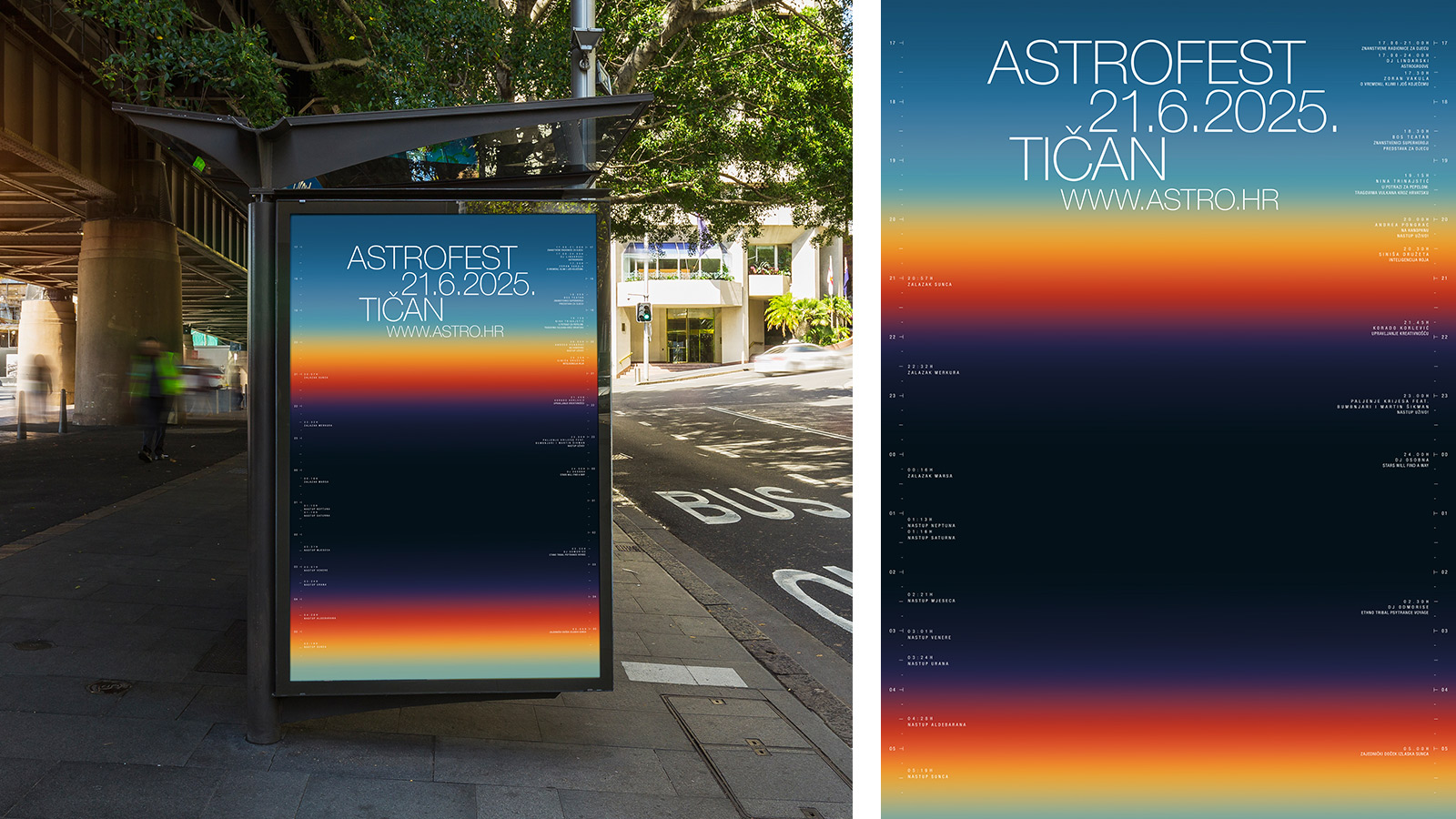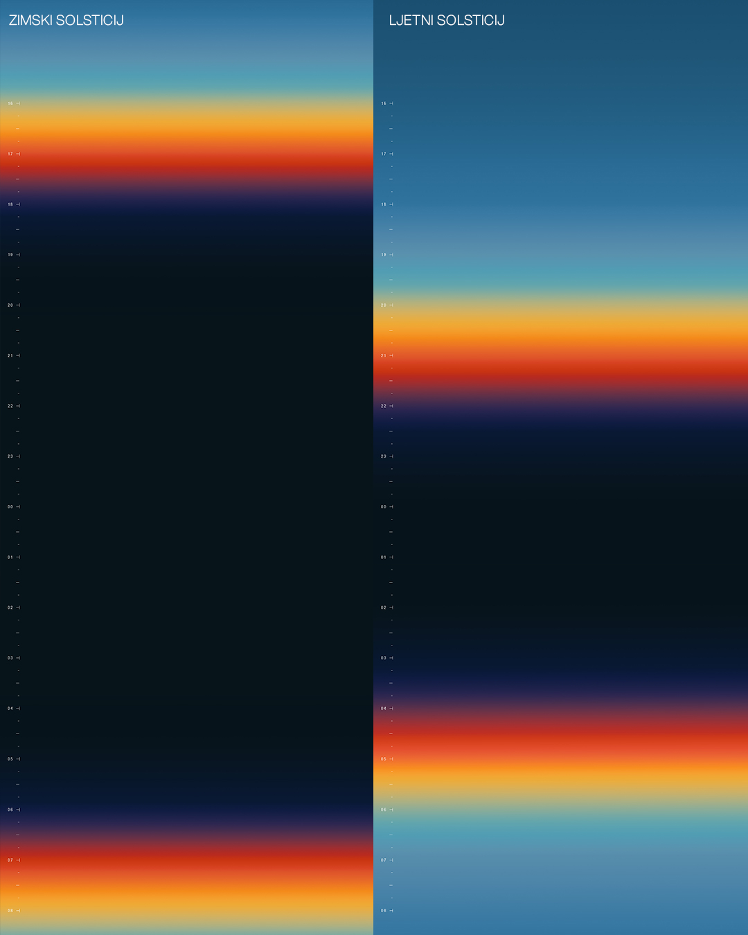 The magnificence of the Venus Belt on the day of the solstice served as the inspiration for the concept. In execution, the poster features a colour gradient that literally translates the colours visible in the sky during a specific time period (an hour), on the day of the solstice. Thus, the colour itself, being identical in the sky and on the poster, communicates the timing of individual performances, effectively, through colour, turning the poster into a kind of time indicator—a clock. The left side of the poster announces the performances of the planets in the sky, which can be followed from the Observatory, both with the naked eye and via telescope. The right side announces the performances on stage and the activities held in honour of the solstice.
