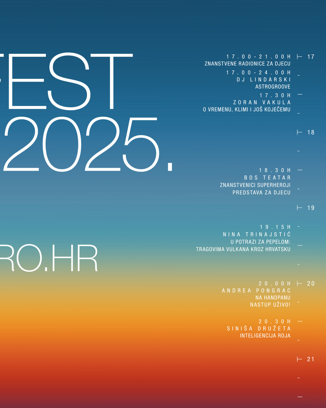The Astro festival, hosted by the planetary popular Višnjan (Tičan) Observatory, takes place every year on June 21st, the day of the summer solstice. This date officially marks the astronomical start of summer, serving as the longest and brightest day of the year. What is truly characteristic of this day is that the Venus Belt (Definition: a luminous phenomenon that occurs in the Earth’s atmosphere in the form of a wide, pink-orange strip of light extending across the sky above the horizon, precisely on the opposite side of the Sun, in the anti-twilight point) lasts the longest, thus featuring the most beautiful and diverse colours. Astro festival kicks off at 5 PM, as the audience collectively invokes the sunset. The festivities continue through the night until 5 AM the following morning, right up to the moment of sunrise. The event features various activities, band performances, and also, uniquely: PERFORMANCES BY THE PLANETS THEMSELVES!